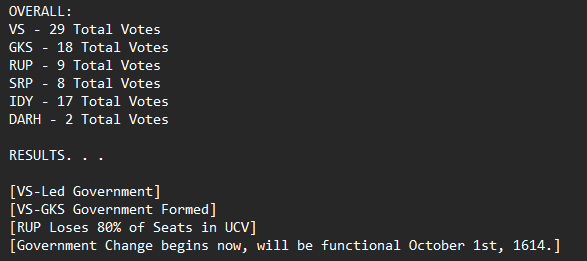 An extremist party formed after what many considered the short-lived Veskaran "golden age", they blame socialists, and in recent years, the RUP for stripping Veskarei of its pride and glory. They have advocated for pan-Eskarism, the merging of all cultures and dialects into one great culture of the old times. While that is a noble goal, this does also mean the extermination or forced removal of most, if not all minorities within Veskarei. They also call for the Veskaran state to return to the days of glory, by forcing their will upon other nations, and oppressing anyone they can. Their candidate is Ladt Gezen, a highly controversial figure from Veskaris, and military officer within the army.